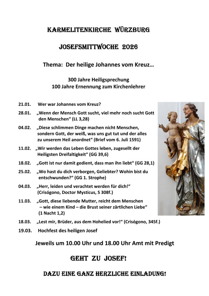 Zu den Gottesdiensten mit Predigt um 10 Uhr und um 18 Uhr, für die eine Predigtreihe über den heiligen Johannes vom Kreuz vorgesehen ist, sind Sie herzlich willkommen.
